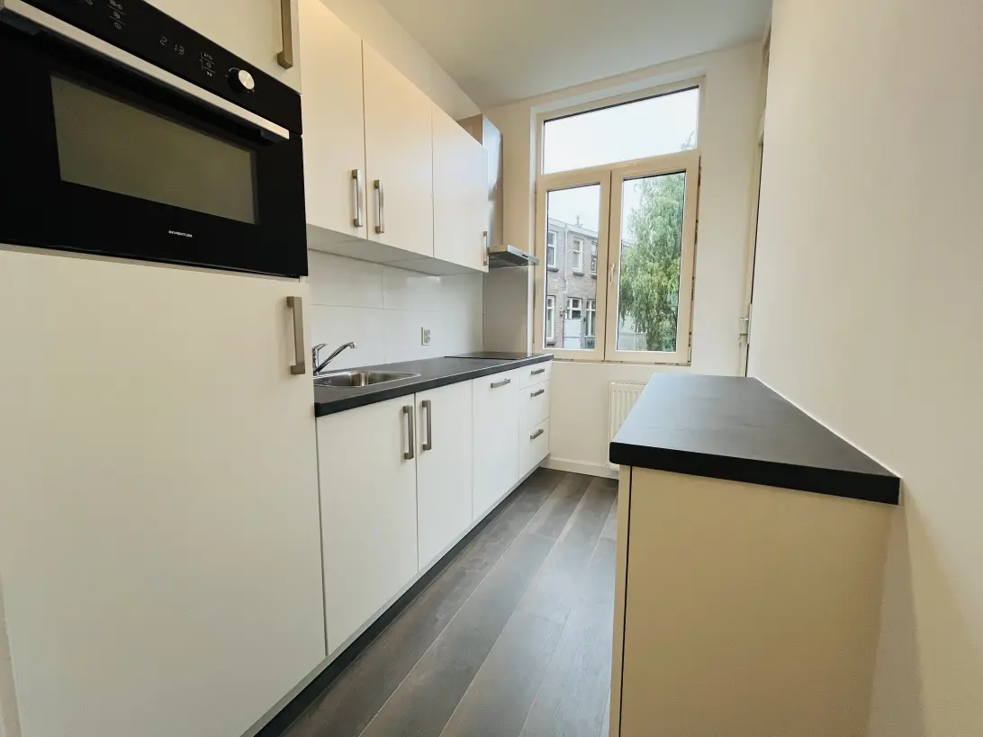 Openportiek, u neemt de trap naar de 1e etage waar het appartement zich bevindt. Voordeur, entree appartement in de hal. U neemt de trap naar de 2e etage met entree op overloop waar het toilet is gesitueerd. Woonkamer gelegen aan de voorzijde van circa 41m². Gloednieuwe keuken voorzien van een inductie kookplaat, afzuigkap, koelkast, vriezer, vaatwasser en een combi oven. Middels de keuken heeft u toegang tot het balkon. Twee slaapkamers waarvan één circa 5m² en één van 11m².