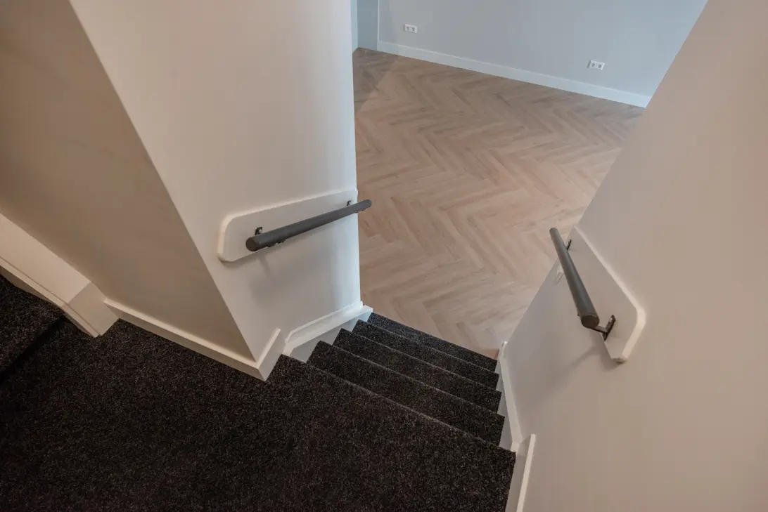 INDELING: Entree op straatniveau, waarna u de hal betreedt. Via de voordeur komt u binnen in het appartement, waar zich in de hal een separaat toilet met fontein bevindt. De ruime woonkamer van circa 37 m² biedt veel comfort en staat in open verbinding met de luxe open keuken met kookeiland. De keuken is voorzien van een kookplaat, koelkast, vriezer, afzuigkap, combi-oven en vaatwasser. Via de trap bereikt u de eerste etage, met entree op de overloop waar zich een tweede separaat toilet met fontein bevindt. Hier treft u twee slaapkamers van circa 12 m² en 5 m². Vanuit beide slaapkamers heeft u direct toegang tot het terras aan de achterzijde, gelegen op het noordoosten, ideaal om in de ochtend te genieten van de zon en in de middag van een aangename schaduw. De badkamer is uitgerust met een douche en wastafel.