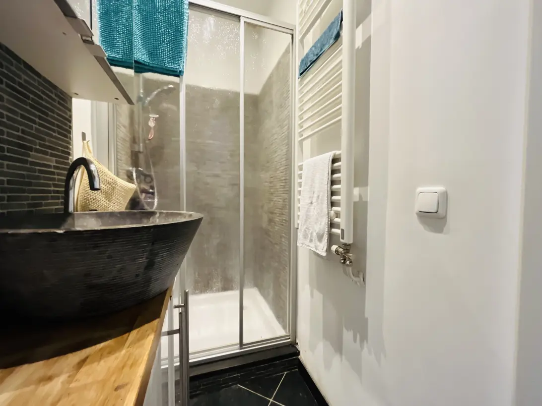 LAY-OUT: Entrance at street level, you enter the common area. The apartment is located directly on the ground floor at the front. Front door, entrance to the apartment into the living room of approx. 20 m². Open kitchen equipped with a cooking plate, refrigerator, and extractor hood. Bedroom of approx. 7 m². Bathroom equipped with a shower and washbasin. The toilet is separate.
